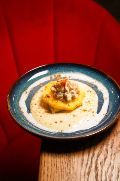 Cuisse de pintade, crème st-herbleu, brunoise de marron persillé & poire au vin blanc